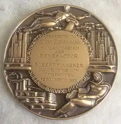 • Sam Briskman, inventor of pinking shears.[2] On reverse: Presented to Sam Briskman, humanitarian and benefactor, by Robert F. Wagner, Mayor of the City of New York, February 19, 1958.