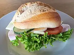 A broodje gezond (meaning "healthy sandwich") is a Dutch sandwich. The sandwich is often a piece of baguette, a white roll, or a pistolet. Toppings include, for example, cheese, ham, a boiled egg in slices, vegetables such as lettuce, arugula, tomato, pepper and/or cucumber. The sandwich is dressed with mayonnaise or a yogurt-based sauce.[1][2] Due to the high levels of fat and salt and the low levels of vitamins, the term 'healthy' in the name is questionable.[3]