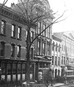 The Brooklyn Theatre opened on October 2, 1871 and stood near the southeast corner of Washington and Johnson streets[4] one block north of Brooklyn's City Hall.[5] It was owned by The Brooklyn Building Association, a partnership of affluent Brooklyn residents including Abner C. Keeney, William Kingsley, and Judge Alexander McCue.[6] After its destruction, the Brooklyn Daily Eagle called it Brooklyn's "principal theatre."[7] The theatre had been managed by Sara and Frederick B. Conway until the last 20 months of its existence; the Conways were long involved in New York and Brooklyn theatre, having managed Brooklyn's Park Theatre from 1864 to 1871.[8] Sara Conway died in April 1875,[9] about six months after her husband. Their children Minnie, Lillian, and Frederick Jr. then managed the theatre for a short time, but without success.[9] Albert Marshman Palmer[10] and Sheridan Shook were the manager and proprietor of New York's Union Square Theatre, and they assumed a new lease on the Brooklyn Theatre later in 1875, managing it until the catastrophe took place.[11]