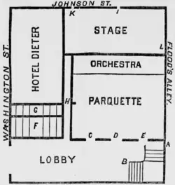 The theatre occupied an L-shaped lot, with the Proscenium theatre occupying the 127-by-70-foot (39 m × 21 m) wing fronting Johnson Street. The stage and scene doors opened onto Johnson Street from this wing. The scene doors were 20 ft wide (6.1 m), large enough to accommodate scenic flats and large props.[23] The stage doors were smaller but could accommodate people carrying heavy loads. These Johnson Street doors were utilitarian and little used by the public.[24] The shorter 27-by-40-foot (8.2 m × 12.2 m) wing on Washington Street housed the main entrance to the lower floors and a separate staircase to the third floor theatre gallery. They were for public use, and Jackson considered these main entry ways to be large enough to discharge a full house of 1,450 people in less than five minutes.[25]