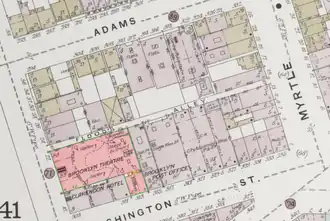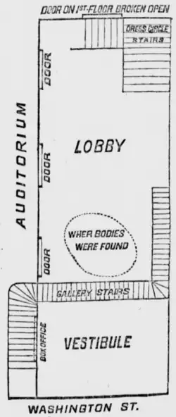 There were three sets of doors which Jackson designated as special exits. They led onto Flood's Alley, a small street running along the east side of the building that bisected the block from Johnson to Myrtle Avenue.[26][27] Each set was six feet (1.8 m) across. The southern door closest to Myrtle Avenue opened into the eastern end of the lobby, underneath the flight of stairs leading from the lobby to the dress circle. The middle set opened onto a hallway adjoining the parquet, and the northern set opened near the stage and orchestra pit. The middle set served a stairway ascending to the second floor dress circle.[28] These alley doors were normally locked to discourage gate-crashing.[27] The structure had no fire escapes in the modern sense: those that connect higher storey windows to the street. Sources from the period often called these alley doors "fire escapes," but designs of the era were untested and tended to be impractical.[29]