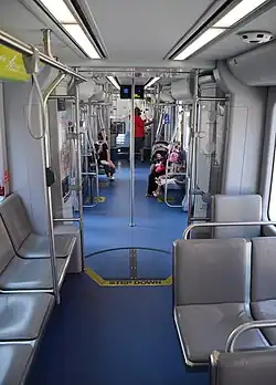 The streetcar is a 70% low-floor design that measures 66.5 feet (20.27 m) in length and can seat 32 passengers; it is also capable of accommodating between 125 and 150 people while fully loaded.[3][4][5] Empty, each car weighs 79,000 pounds (35,800 kg).[4] The streetcar rides on Brookville's Soft-Ride trucks on standard-gauge track, and can reach a top speed of 35 to 44 miles per hour (56 to 71 km/h).[3][7] The streetcar's loading gauge varies between 96 inches (2,438 mm), in Dallas, and 104 inches (2,642 mm), in Detroit and Milwaukee.[3][4][5]