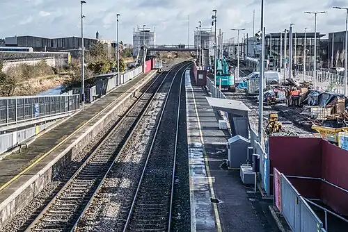 The Luas Broombridge interchange station is the northside Dublin terminus of the Luas Green Line extension and services began in December 2017.[2] From Broombridge, the tram route takes the old MGWR route to its Broadstone terminus site before continuing to Dublin City Centre. The Broombridge-Hamilton LUAS maintenance depot lies to the south of the line on the final part of the approach to the station.[1]