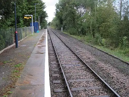 The line was double track and the station had two platforms until the 1960s,[4] but the line was singled in 1965 and the station now has a single platform. The station buildings have since been demolished and replaced with a bus shelter structure.