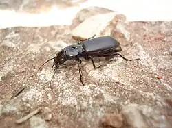 Broscus cephalotes are primarily carnivorous beetles; however they will consume a wide variety of food. They are generalists, and the adults do not discriminate much in what they consume.[5] A recent study showed that B. cephalotes in laboratory conditions will attack everything that runs across the opening of its burrow, though they preferred to attack and eat woodlice and ants.[6] Some of what has been found in various beetles’ digestive tract include: plant material and various types of insects: ants, wolf spiders, Aphididae, caterpillars, Diptera, Acarina, Bibionidae, Coleoptera, adult Lepidoptera, and Heteroptera.[5] However, there has been no evidence of cannibalism in this species of beetle.[5] The diet of the larvae of this family has not been as widely studied because the larvae spend their time in tunnels and are difficult to identify even when not hidden in the soil. Carabidae larvae are usually more carnivorous than adults and have a more restricted diet.[7] The limited diet may be due to their subterranean habitat and their small size. Additionally, the larvae of Carabidae beetle tend to be fluid feeders, regardless of their status as adults.[7]