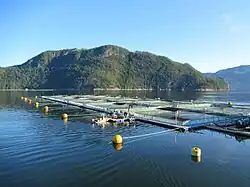 In the archipelago lie several salmon farms.[20] The first salmon farm was introduced into Broughton Archipelago in 1987 and production steadily rose to 17 Gg (gigagrams) by 1999.[21][22] However, due to the nature of open-net pen salmon aquaculture, the tight space became a breeding ground for sea lice.