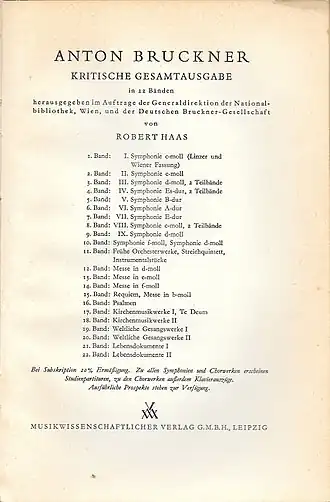This first edition (12 volumes issued)[2][3] included 'hybrid' scores for Symphonies Nos. 2 and 8 and other similar conflations for some other revised works (Mass No. 3).