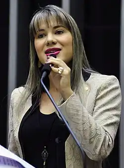 She is the daughter of Adalberto Ferreira da Silva and Irani Aparecida da Silva.[1] Before becoming a politician she was the hostess of the television program Brunny e Vc a local television show shown primarily in her hometown of Governador Valadares and broadcast by TV Alterosa.[2] Gomes is married to Hélio Gomes, a businessman and politician who serves in the Minas Gerais state legislature and is 37 years the senior of Brunny.[2]