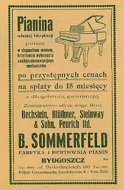 The Bruno Sommerfeld Piano Factory (Polish: Fabryka Pianin i Fortepianów Brunona Sommerfelda) was a Polish piano manufacturing company that operated in the city of Bydgoszcz from 1905 to 1945. It was the largest piano factory in interwar Poland.[1]