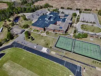 In 1938, a new high school building was planned by architect Harry S. Coombs and constructed with Works Progress Administration funds[7] on the corner of Spring and McKeen Streets to the west of downtown Brunswick. In 1951, a one-story wing of classrooms was constructed off the southern portion of the western side of the original structure. A second floor of classrooms was added to this south wing in 1961, along with a new two-floor wing off the northern portion of the original building's western side. The new north wing mirrored the 1951 addition and created a courtyard. The two floors of the north wing provided more classrooms, a new gym, a cafeteria, a wood shop, science labs, and Home Economic rooms. By the 1990s the school was using temporary trailers as classrooms to deal with over-crowding and failed a state inspection. These and other factors contributed to the push to build a new school. The 1937 building and its additions later served temporarily as the location of Mount Ararat Middle School for the neighboring school district (School Administrative District #75) and was demolished in order to construct a new elementary school (Harriet Beecher Stowe School) at the site, which opened in 2011.