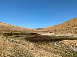 The park is named for Brushy Peak (elevation 1,702 feet (519 m)), a mountain in the Diablo Range, that has had historical significance dating back to Native Americans who lived in the region before the arrival of European settlers.[1] It was a focus of trade routes that connected the Bay Area Ohlones, Bay Miwoks, and Northern Valley Yokuts.[2] According to the EBRPD, "The Ssaoam triblet of the Ohlone peoples was probably the most closely linked to the Brushy Peak area, living in the surrounding dry hills and tiny valleys around the peak and nearby Altamont Pass. Ssaoam populations in the dry summer months may have dispersed and reconverged at various camps throughout the year."[1] Today, access to the top of the mountain is closed to the public to protect grounds that were sacred to ancient Native American tribes.[2]