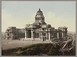 The first stone was laid on 31 October 1866.[18] At Poelaert's request, the management of the works was entrusted to the engineer François Wellens, Inspector General of the Ministry of Public Works and President of the Royal Commission of Monuments between 1865 and 1897.[19][17] After Poelaert's death on 3 November 1879, the construction was taken over by the architect Joseph Joachim Benoît.[17] The building was inaugurated on 15 October 1883 by King Leopold II in the presence of his wife Queen Marie-Henriette, his daughter Princess Clémentine, and members of the Belgian royal family.[20][1] As for the old courthouse, it was demolished in 1892 for the construction of the Rue Lebeau/Lebeaustraat, which leads into the Place de la Justice.[21]