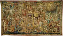 A Hunts of Maximilian suite, depicting hunting in each of the months, was woven to cartoons by Bernard van Orley ca1531-33.[10] A suite of nine allegorical Honors that celebrated the coronation of Charles V as king of Germany and his assumption of the title of Holy Roman Emperor-elect in 1520 survives among the Patrimonio Nacional, Palacio Real de la Granja de San Ildefonso, Spain.[11] Van Orley's pupils, Pieter Coecke van Aelst and Michiel Coxie, also provided cartoons for Brussels looms under the general influence of Italian painting. A set of Seven Deadly Sins, of which four survive,[12] are recognized as Pieter Coecke van Aelst's masterpieces.[13][14]