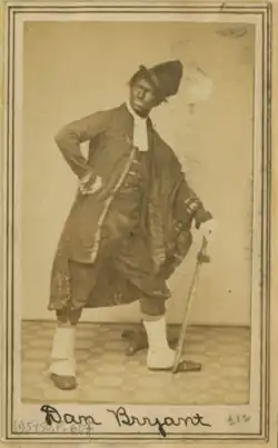 The eldest brother Jerry, a veteran of the Ethiopian Serenaders, Campbell's Minstrels, E.P. Christy's Minstrels and other troupes, sang and played tambourine and bones. Dan Bryant, who had toured with Losee's Minstrels, the Sable Harmonists and Campbell's Minstrels, sang and played banjo. Neil (Cornelius) Bryant played accordion and flutina. Other members, including English-born fiddler Phil Isaacs, rounded out the original roster.[2] All of the minstrels danced and acted in comedy segments, which were often improvised.[3][4]