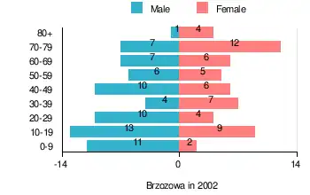 According to the 2002 Poland census, there were 124 people residing in Brzozowa village, of whom 55.6% were male and 44.4% were female. In the village, the population was spread out, with 25.8% under the age of 18, 29.8% from 18 to 44, 17.7% from 45 to 64, and 26.6% who were 65 years of age or older.[1]