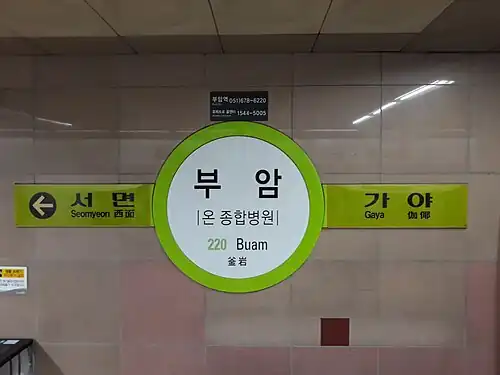 Buam Station (Korean: 부암역; Hanja: 釜岩驛) is a station on the Busan Metro Line 2 in Beomcheon-dong, Busanjin District, Busan, South Korea.