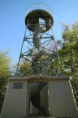 On the hill top there is the Kronprinz-Rudolf-Warte, an observation tower that was built in 1879 and is eleven meters high. The iron construction was last renovated in 2017 and offers a view over the city of Graz. An octagonal predecessor structure had stood there since 1840. The historical observation tower is named after the emperor's son Rudolf, Crown Prince of Austria who committed suicide ten years after the construction.[23][24] In 2010 a modern viewing platform was established at 567 meters above sea level, on the western slope of the hill. At 25 meters long, the wooden platform resembles an arrow and lasts on five stanchions up to 13 meters above the ground. The view towards the west covers parts of the Western Styrian hills as well as the Styrian Prealps.[25]