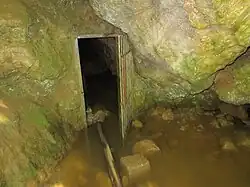 In the course of these processes profound joints were created that made the development of caves and sinkholes possible.[5] Following the miocene karstification, the ridge was buried under loose sediments. The removal of these sediments during the Riss/Würm interglacial period happened asymmetrical because of the mighty down-cutting of the Mur river. As a result, the eastern slope of the Buchkogel shows a concave profile. On the western side a blind valley with numerous sinkholes and little poljes was formed. The sparse creeks run through a ponor into the mountain and emerge from the Eisbründlhöhle, a small cave about 70 meters below on the eastern foot of the hill.[5][6] At that sea level the Devonian rocks meet the loamy and thus water-damming sediments of the Riss terrace.[7] The subsurface connection at the narrowest part of the hill ridge could be scientifically verified in the 1950s via dye tracing.[8] This means that the hill has its own closed karst water system which is not connected to the Mur valley's groundwater body.[5]