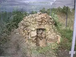 On the eastern foothill one of about 15 Roman grave fields in Graz has been excavated.[16] The grave field is known since the 15th century and is composed of at least 18 tumuli.[17] In the years 2003 and 2004 three of these tumuli were examined in detail for the first time ever. The middle one located at the edge of the forest turned out to be the most important one and revealed a completely preserved Roman grave for the first time in Graz.[14] The beehive-shaped grave was built of clay-smeared limestone and has a dromos and an almost unharmed grave chamber. The nearly round chamber with a diameter of 2.8 and a height of about 1.4 meters contained the remains of two or three funerals as well as intact grave goods. Along with a completely preserved tripod shell and the shards of a drinking cup the grave contained a copper or bronze coin with the face of Antoninus Pius which made it possible to date it back to the second century.[18] The type of grave installation has been called typical for the region of northeast Styria and Burgenland.[16] Both of the other graves were showing signs of looting but still contained fragments of a ceramic pot, broken glass and another coin. The first hill was roofed with a steel and glass construction and made visible for the public while the other two were filled up again.[18] Because of its great condition the grave field has been declared a cultural heritage monument.