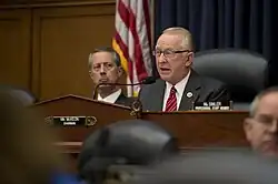 McKeon said if forced to choose between tax increases and cuts to the Pentagon budget, he would choose tax increases.[19] However he would prefer to cut entitlement spending instead.[20][21] In 2012, McKeon sought a one-year fix to stave off the defense budget cuts from sequestration, although he had previously voted for the Budget Control Act of 2011, which included sequestration.[22] McKeon led efforts by some Republicans that contributed to replacement of the sequester cuts for 2014 and 2015 with the Bipartisan Budget Act of 2013.[23] In 2014 McKeon said of Obama's plan to raise taxes on banks and millionaires, "I think that would be wonderful but it's not going to happen".[24] He dismissed calls to replace USMC jet fighters destroyed by the Taliban in the September 2012 Camp Bastion raid.[25][26]