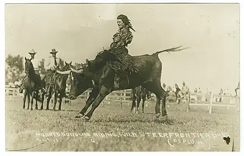 A bucking bull is a bull used in rodeo bull riding competition. They are usually a Brahman crossed with another breed, weighing 1,500 pounds or more, selected for their tendency to "leap, plunge and spin" when a human is on its back.[1] In the mid-20th century, breeders began selecting bulls for bad temperament; ones that would buck when ridden.[2] Many of the best bucking bulls trace their lineage to bulls owned by Charlie Plummer of Oklahoma. These are known as Plummer bulls.[3]