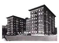 It was common for guests to live permanently at the hotel,[11] including the hotel's president, Walter James Holbrook.[12] The capitalist Ellis Wainwright died in the hotel in 1924 after living there as a recluse.[13] After 1920, the hotel faced stiff competition from the Chase Hotel, just a block north, and declined in significance. In December 1927, a fire in the hotel's annex led to the death of seven people.[14] The Buckingham Realty Company, which operated the hotel, fell into bankruptcy in 1928, and it sealed the fate of the Buckingham Hotel;[1][15] the intermingled accounts of the Buckingham Hotel Property and the Buckingham Annex constituted part of the problem.[16]