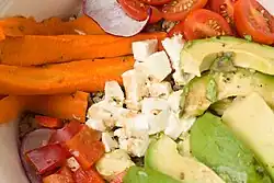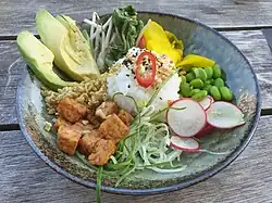 A Buddha bowl is a vegetarian meal, served in a single bowl or on a high-rimmed plate, which consists of small portions of several foods, served cold.[1][2] These may include whole grains such as quinoa or brown rice, plant proteins such as chickpeas or tofu, and vegetables.[3][4] The portions are not mixed on the plate nor in the bowl but arranged “artfully”. Buddha bowls have been compared to nourish bowls (a non-vegetarian version) and to poké bowls (a Hawaiian raw fish dish).[5][1]