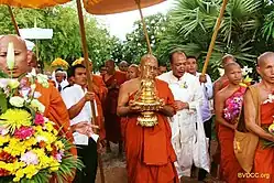 Following the defeat of the Khmer Rouge by Vietnamese forces, Buddhism initially remained officially suppressed in Cambodia.[18] Following challenges to the legitimacy of the Vietnamese-backed People's Republic of Kampuchea, policies towards Buddhism began to ease starting in the summer of 1979.[22] A group of monks who had been exiled and re-ordained in Vietnam during the Khmer Rouge period were sent to Cambodia,[23] and in 1981 one of their number, Venerable Tep Vong, was elected the first sangharaja of a new unified Cambodia sangha, officially abolishing the division between the Thommayut order and the Mohanikay.[22] The ordination of new monks was sponsored by the government as a public show of piety and lifted restrictions on ordination.[20]