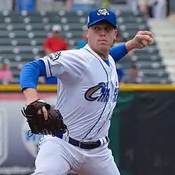 ![]() Baumann pitching for the Omaha Storm Chasers in 2015 | |||||||||||||||