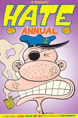 Harold "Buddy" William Bradley Jr.,[1] generally referred to as Buddy Bradley, is a comic book character created by Peter Bagge and the main protagonist in several of his comic books, most notably Hate and Neat Stuff. The character first appeared in Bagge's self-published Comical Funnies in 1981. In the 1990s Buddy became an iconic symbol of Seattle underground culture, with the character being associated with slackerdom and the grunge movement, something which his creator sees as fairly unintentional on his part. Bagge created Buddy as a fairly unlikeable character as a commentary on shallow hipster culture, but the character was immensely popular, with members of Generation X strongly identifying with Buddy and his problems. In this way he may have been seen as an antihero and archetype of 1990s underground culture. Bagge had the character enact storylines based on events from his past, such as his family life, adolescence and his move to Seattle in the 1980s. Buddy is a disaffected adolescent who is a self-proclaimed outsider. He is directionless and unmotivated, drifting through life without goals and commonly has a cynical attitude to almost everything. By his twenties he has not changed much, although he is rather more comfortable in his hipster persona, fitting into the Seattle grunge scene and listening to obscure rock music as proof of his hip credentials. He has a brittle personality and is quick to anger, often becoming violent and getting into fights, be it with his family, friends, spouses or rivals. He has a ruthless and selfish streak which he uses to his advantage in his business dealings as a music promoter, memorabilia salesman and junkyard dealer.