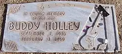 Holly's funeral was held on February 7, 1959, at the Tabernacle Baptist Church in Lubbock. The service was officiated by Ben D. Johnson, who had presided at the Hollys' wedding just months earlier. The pallbearers were Jerry Allison, Joe B. Mauldin, Niki Sullivan, Bob Montgomery, and Sonny Curtis. Some sources say that Phil Everly, one half of The Everly Brothers, was also pallbearer, but Everly said that he attended the funeral but was not a pallbearer.[56] Waylon Jennings was unable to attend because of his commitment to the still-touring Winter Dance Party. Holly's body was interred in the City of Lubbock Cemetery, in the eastern part of the city. Holly's headstone carries the correct spelling of his surname (Holley) and a carving of his Fender Stratocaster guitar.[57]