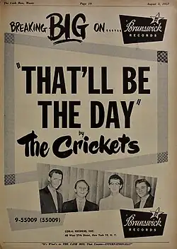 "That'll Be the Day" was released on July 27, 1957. Petty booked Holly and the Crickets for a tour with Irvin Feld, who had noticed the band after "That'll Be the Day" appeared on the R&B chart. He booked them for appearances in Washington, D.C., Baltimore, and New York City.[22] The band was booked to play at New York's Apollo Theater, a Harlem-based theater widely known for frequently having African American-oriented entertainment,[23] on August 16–22. They would be the first white act to perform at the theater.[24] During the opening performances, the group did not impress the audience, but they were accepted after they included "Bo Diddley". By the end of their run at the Apollo, "That'll Be the Day" was climbing the charts. Encouraged by the single's success, Petty started to prepare two album releases; a solo album for Holly and another for the Crickets.[25] Holly appeared on American Bandstand, hosted by Dick Clark on ABC, on August 26. Before leaving New York, the band befriended The Everly Brothers.[26]