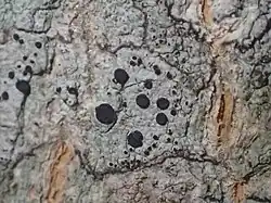Buellia erubescens, the common button lichen, is a species of lichen in the genus Buellia.[2] It is found commonly on the bark and occasionally on the wood of Quercus, Pinus, Juniperus, or other species of trees with bark that has generally low pH. It is common between 600 and 3,000 m (2,000 and 9,800 ft) elevation, and is common in submontane to subalpine forests.[3]