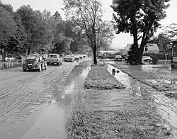 Buena Vista is situated on the east side of the Maury River at the western foot of the Blue Ridge Mountains. The Maury has a history of destructive floods damaging nearby communities. Particularly notable were floods on Oct 12, 1870, on the death of Robert E. Lee, when the Maury River provided Lee a temporary coffin due to a dock washed away up river (source: Library Virginia Military Institute), and in 1936, 1969, 1985 and 1995.[14] The Flood of '69 was the result of rainfall from the inland movement of Hurricane Camille. The Flood of '85 resulted from the convergence of three systems, including Hurricane Juan, which dumped tremendous amounts of rain on western Virginia.[15] The flood of record for the lower Maury River (downstream of the confluence with the South River), including Buena Vista and Glasgow, occurred on August 20, 1969, at a stage of 31.23 feet (9.52 m) on the Buena Vista gauge. (Flooding begins at 17.0 feet (5.2 m) and major flooding at 21.0 feet (6.4 m).[16]) The downtowns of Buena Vista and Glasgow were submerged in over 5 feet (1.5 m) of water.[15] The upper Maury River including Lexington saw its flood of record during the Flood of 1985 when the gauging station at Rockbridge Baths recorded a value of 19.19 feet (5.85 m) from flood marks.[17] The difference in flooding results from differing contributions of the South River depending on rainfall in the respective watersheds.