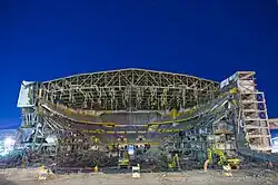 Asbestos removal and other environmental remediation took place in late 2008 and the expected $10 million demolition of the Aud[13] began in January 2009. On February 9, 2009, the "Buffalo Memorial Auditorium" entablature above the main entrance fell and much of the front façade met the same fate soon afterward. The "Farewell Buffalo Memorial Auditorium Ceremony" took place on June 30, 2009, at 1:30 pm when officials opened the copper box time capsule. The structure's final pieces came down in early July 2009.