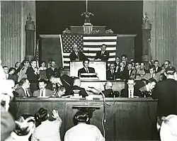 During his first term, Ellington continued many of Clement's policies. Aided by an economic boom, he could approve raises for public school teachers and school administrators without increasing taxes.[1] While he supported continued legal segregation, he ordered the state to comply with the U.S. Supreme Court's decision in Brown v. Board of Education (1954) that ruled that segregation in public schools was unconstitutional; it ordered desegregation of the public school system.[2]