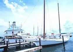 One of the best examples of the type still in existence is the Edna E. Lockwood, which is on exhibit at the Chesapeake Bay Maritime Museum in Saint Michaels, Maryland. The Lockwood is a nine log bugeye launched on October 5, 1889 at Tilghman Island, Maryland, by John B. Harrison for Daniel Haddaway, at a cost of $2,200. She worked for at least seven sets of owners from 1899 until 1967, and was then sailed as a yacht until donated to the museum in 1973. The museum undertook an extensive restoration of the Lockwood from 1975 through 1979, which restored the bugeye to its 1910 appearance with the "patent stern" that had been added sometime prior to that year. She is the last bugeye retaining the sailing rig and working appearance of the type, and is a National Historic Landmark. Her length is 53 ft-6 in, with a 15 ft-3 in beam and a 2 ft-7 in draft with the centerboard up, and a maximum sail area of approximately 1,700 square feet (160 m2).