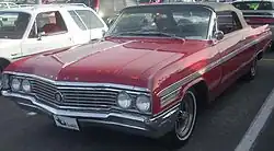Minor facelifting with new grille and horizontal taillights replacing the 1963's vertical units highlighted the 1964 LeSabre. A somewhat better equipped "Custom" version also joined the lineup this year, easily identifiable by its full length chrome side molding with a brushed metal insert. The regular LeSabre had a narrow trim piece on the rear third of the body.[4] Under the hood, the 401-cubic-inch V8 was replaced in LeSabre sedans and coupes by a smaller 300-cubic-inch V8 designed for the upsized Special/Skylark intermediates that replaced the aluminum V8 in those vehicles. In standard form, the 300 was rated at 210 horsepower with two-barrel carburetor and 9 to 1 compression ratio for use of regular fuel. Optionally available was a 250-horsepower version of the same engine with four-barrel carburetor and higher 11 to 1 compression ratio mandating the use of premium fuel. The LeSabre Estate Wagon came standard with the larger 325-horsepower 401 V8 from the Wildcat and Electra 225 models. Replacing the old Dynaflow-based two-speed automatic transmission were two new Super Turbine automatics. The two-speed Super Turbine 300 (shared with the intermediate-sized cars) was available with the standard two-barrel 300 V8 while the three-speed Super Turbine 400 (shared with other big Buicks and Rivieras) was standard with the 300 four-barrel and optional with the standard engine as well as the 401 in the Estate Wagon. The standard transmission with the base 300 two-barrel V8 was a three-speed column shift manual and a four-speed manual was available as an option with either engine. The new ST300 transmission carried over the variable pitch torque converter from the Dynaflow that had been used since the mid-1950s, while the first year for the ST400 featured a fixed-pitch converter. Inside, only minor trim/upholstery revisions were made.[2]