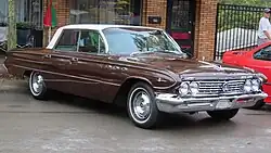 The 1962 Buick LeSabre was only moderately changed from the previous year with bodies taking on a few extra inches to give them a longer look along with new grilles and taillights. Two-door hardtop coupes received a new convertible-like roofline complete with simulated bows. Under the hood, the 364 cubic-inch V8 was replaced by the larger 401 cubic-inch V8 used in Invictas and Electra 225s. LeSabres came standard with a two-barrel high-compression (10.25 to 1) version rated at 280 horsepower with a low-compression regular fuel version of that same engine rated at 265 horsepower offered as a no-cost option. Optional at extra cost was the four-barrel 325-horsepower 401 which was standard on the Invicta, Electra 225 and the mid-year Invicta-based Wildcat coupe. Inside, interiors were mildly revised with the "Mirrormatic" speedometer replaced by a conventional horizontal sweep unit.[2]