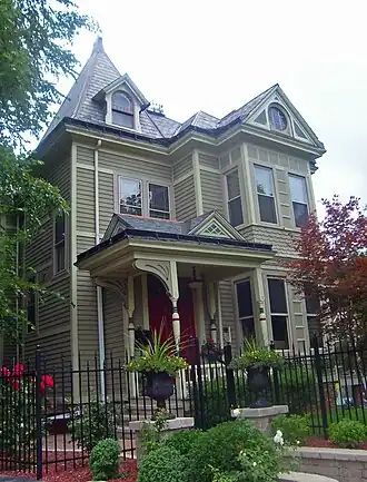 There are three entrances on the first floor, all with their own gable-roofed porch and patterned pediment. Two have curved, routed brackets as supports. The building's fenestration is similarly eclectic, including round and polygonal windows and colored-glass inserts next to angled muntins.[2]