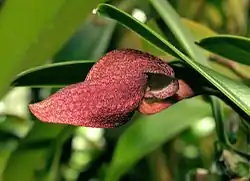 The species is slow-growing epiphyte with an ascending growth habit. Its pseudobulbs are ovoid, 1-leafed at the apex, spaced of about 2.5 cm on a creeping rhizome. Leaves are oblong, dark green, 4.5~9 cm long. Inflorescence is from the base of the pseudobulb and single-flowered, 14 cm long. Flowers are 5 cm long with a dorsal sepal with pointed apex bent forward. lateral sepals are falcate, converging at the apex. Flowers are colored with maroon macules.[1]
