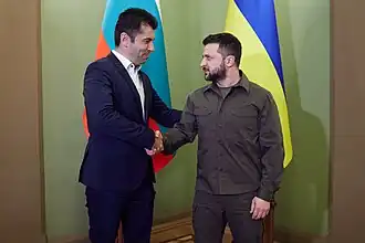 Bulgaria supported the Ukrainian position following the 2014 annexation of Crimea by the Russian Federation and the subsequent War in Donbass, with Bulgarian President Rumen Radev calling the annexation a violation of international law.[13] Bulgaria became a strong supporter of Ukraine after the country was invaded by Russia in 2022. The country accepted up to 500,000 Ukrainian refugees fleeing the war.[14] Bulgarian Prime Minister Kiril Petkov visited Kyiv in April 2022 as a show of support to the country.[15] Bulgaria became a critical supplier of diesel, weapons and ammunition to Ukraine in the early stages of the war, and Bulgaria took a leading role in the imposition of sanctions against Russia on the initiative of Prime Minister Petkov and Finance Minister Asen Vasilev during a meeting with other EU delegates.[16] Bulgarian weapons factories have also been repairing damaged Ukrainian tanks.[17]