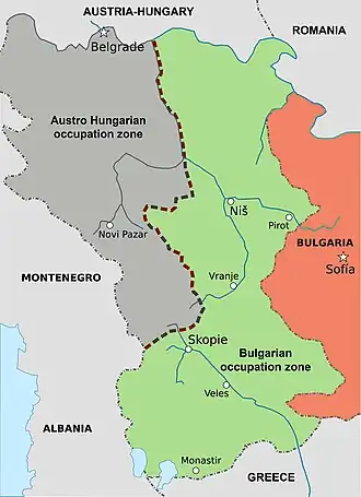 ![]() Bulgarian occupation zone of Serbia (in green) | |