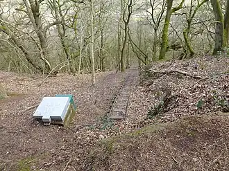 The incline was used during the construction of the Bulkeley Hill Reservoir and the water pipeline to overcome a height difference of about 345 feet (105 m).[5] It has three catch points for derailing runaway vehicles. At its bottom station, five reused Lancashire boilers are available as diesel storage tanks for the pumps.[6][4]