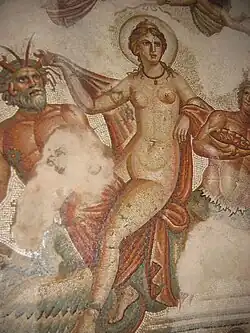 The subtle colors and shading and the modelling of three-dimensional forms of the finest mosaics at Bulla Regia are not surpassed by any in North Africa, where the Roman art of mosaic floors reached its fullest development. The mosaic of a haloed Amphitrite (House of Amphitrite) is often illustrated (see image above).