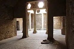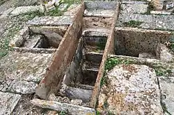 The forum, surrounded by porticoes, was excavated 1949–52. Its public basilica had an apse at each end. As a cathedral, it had a highly unusual cruciform baptismal font inserted in the center of the rear (west end) of its nave.[5] Its small amphitheater, the subject of a reproach in a sermon of Augustine of Hippo, retains the crispness of its edges and steps because it lay buried until 1960–61.