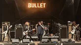 Bullet is a Swedish heavy metal band, formed in Växjö in 2001 by Hampus Klang and Dag "Hell" Hofer. The band released their first demo Heavy Metal Highway 2002 and released their album Heading for the Top in 2006 on Black Lodge record label.[2] Iron Maiden singer Bruce Dickinson played the Bullet song "Turn it Up Loud" from their album Heading for the Top on his radio program on BBC 2006.