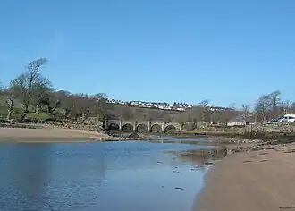 In 1718, Buncrana Castle was built by George Vaughan, it was one of the first big manor houses built in Inishowen, and stone was taken from the bawn, or defensive wall, surrounding O'Doherty's Keep to build it. It was erected on the original site of Buncrana, which had grown up in the shadow of the keep. Vaughan moved the town to its present location, where he founded the current main street and built the Castle Bridge (a six-arched stone single lane bridge) across the River Crana leading to his Castle.[7] By the 1780s, the town was regularly hosting markets for local produce.[8]