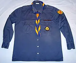 - a Scout scarf in accordance with the age section of the individual: yellow for Cub Scouts, blue-yellow for Scouts and Guides, blue-yellow with the R/R badge sewn onto the corner for Rangers/Rovers; members who have successfully completed their Gilwell/Woodbadge training may wear their beads intertwined with their scarves.