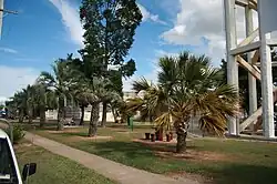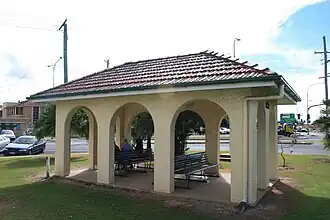 The Memorial Pavilion is situated in a triangular shaped park planted with palm trees opposite the Bundaberg Base Hospital. The park is at the junction of two main streets in Bundaberg with the pavilion facing the corner.[1]